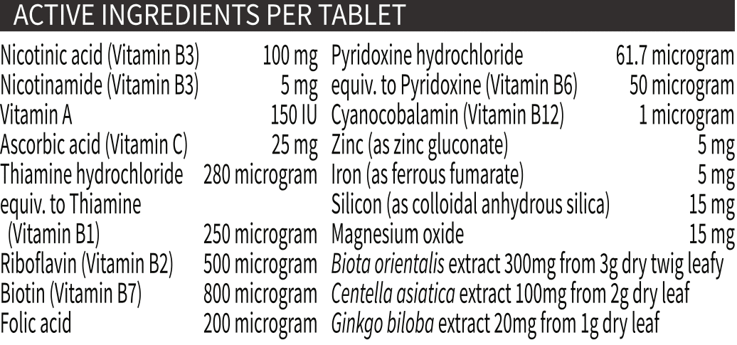 Piliant tablets contain essential nutrients for hair growth, including Nicotinic acid, Nicotinamide, Vitamin A, Vitamin C, Vitamin B1, B2, B6, B7, B12, Folic acid, Zinc, Iron, Silica, Magnesium, Biota orientalis extract, Centella asiatica extract and Ginkgo biloba extract.
